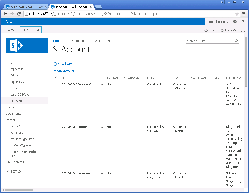 http://my-server/api.rsc/Account?$filter=Industry eq 'Floppy Disks'&$sharepoint=AuthMode:Credentials,TargetApplicationId:my-target-application-Id,ODataConnectionSettingsId:my-odata-connection-settings-Id - To import the external content type into SharePoint, point your browser to the SharePoint central administration portal and click the link to manage service applications.